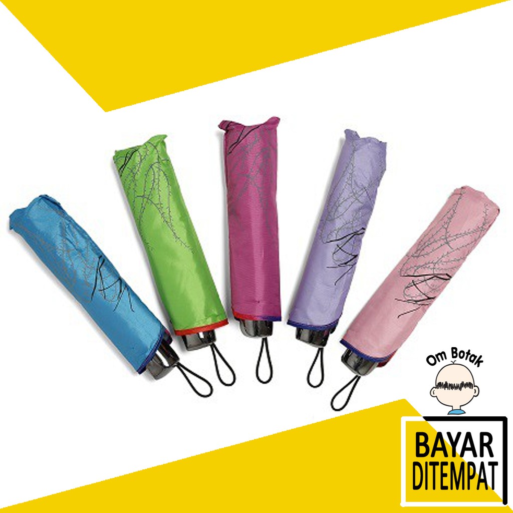 Ready: Biru, Hijau, Fuschia, Ungu dan Pink Harap info warna alternatif yang dipilih. Beda dengan payung abal-abal yang biasa dapat ditemukan di mana2. Di Om Botak, kamu dapat menemukan payung yang fashionable tapi dengan harga ekonomis. Mengapa harus beli payung murah tapi gampang rusak? Dengan besi yang cukup kuat dan model yang cantik, kamu tidak akan menyesal membeli payung di Om Botak. Botak memang berpengalaman :) Payung lipat ini sangat praktis dan fashionable untuk digunakan. Spesifikasi: + Kerangka: Besi Kokoh + Ukuran panjang : 25 cm (kondisi dilipat) + Ukuran panjang : 68 cm (kondisi dibuka) + Ukuran Diameter : 97 cm (kondisi dibuka) + Gagang: Besi KokohDisclaimer :- Produk yang sudah dibeli tidak bisa dikembalikan atau di tukar, kecuali produk yang dikirim bermasalah / error dari pabrik.- Harga dapat berubah sewaktu-waktu tanpa pemberitahuan.- Pengiriman Telat oleh kurir yg anda pilih itu di luar tanggung jawab kami sebagai seller.KETENTUAN WAJIB VIDEO UNBOXING UNTUK BARANG PECAH BELAH TERUTAMA KIRIM DGN EKSPEDISI :1. Produk divideokan dari awal dan UTUH , TIDAK TERPOTONG.2. Tunjukan bahwa produk masih segel dengan jelas.3. Maksimal complain 1x24 jam dari pesanan tiba.4. Kelalaian / kelupaan tanpa video unboxing / lupa sudah cek out karena tidak baca deskripsi bukan merupakan kesalahan kami dan kami TIDAK DAPAT mengganti kerusakan yang ada5. Diwajibkan beli Extra Bubble Wrap sesuai jumlah yang dibeli untuk dapat garansi jika pecahcontoh : pembelian piring 5 buah, artinya klik bubble untuk 5x.**Jika pembelian piring dan bubble tidak sesuai , maka tidak dapat garansi contoh : pembelian piring 3 buah , tapi bubble nya hanya 1 klik , jadi tidak dapat garansi yah6. Jika tidak beli tambahan extra bubble wrap, maka tidak dapat pengajuan claim pengantian barang, walaupun disertai dengan video unboxing.Happy Shopping, dan jangan lupa follow Shopee Om Botak Official Sho