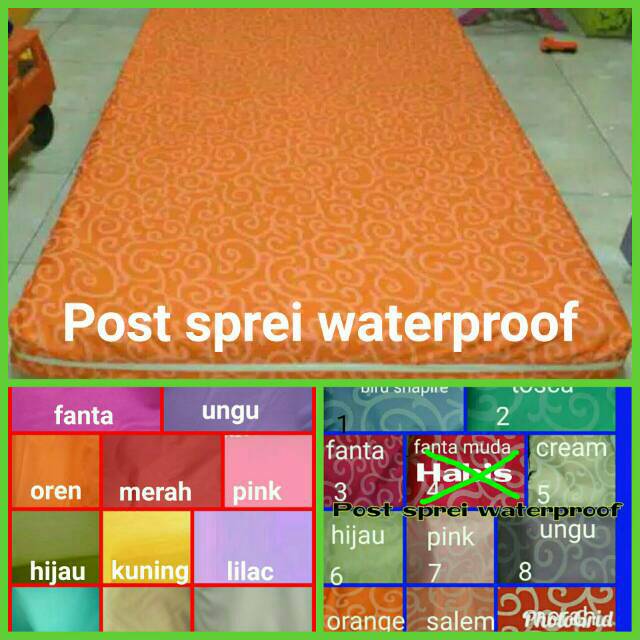 TDK TERIMA CANSELBahan sprei resleting waterproof dgn lapisan bawahnya latex(anti air) . Made by order, ukuran bisa request, PO 4 hari s/d 12 hari setelah proses pembayaran.sprei waterproof gunanya untuk melindungi kasur dari ompol atau tumpahan susu atau air teh dsb.kasur atau spring bed aman dari bau apek serta lebih awet.untuk pilihan warna silahkan dichat aja'catatan.pencucian sprei dgn cara direndam dlm air yg sdh berisi ditergen, lalu dibilas.TDK PERLU DIGILING.dijemur ditempat teduh, usahakan tdk kena sinar matahari langsung, krn sprei cepat kering dan agar warna tdk cepat pudar.TIDAK PERLU DISETRIKA.TDK ADA SAMBUNGAN TENGAH.HARAF DI ISI DI KETERNGAN PILIHAN WARNA#Spreiwaterproof#anti air#anti ompol#perlengkapan rumah#tempattidur#spreianak#spreide