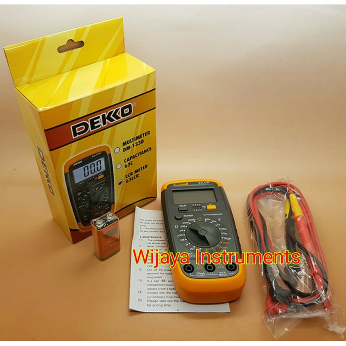 LCR Meter Dekko 63LCRGeneral Charactheristic :- 3,5 Inch Digit Big LCD, Max Indication 1999- Auto Zero & Auto-Polarity- Over Range Indicator of 1 or -1- Low Battery Indicator- Power supply : 9V Zinc Carbon Battery- Temperature for best accuracy : 23 Celcius +/- 5%- Working temperature range : 0 - 40 Celcius- Storage temerature range : -20 - 60 Celcius- Working humidity range : Max 75%RH- Storage humidity range : Max 80%RH- Size : 143x75x32mm- Weight : 200 grMeasurement Specification :- Resistance : 20 Ohm, 200 Ohm, 2K Ohm, 20K Ohm, 200K Ohm, 2M Ohm, 20M Ohm, 200M Ohm 2000M Ohm- Capacitance : 2000PF, 20nF, 200nF, 2uF, 20uF, 200uF- Inductance : 20mH, 200mH, 2H, 20H- Transistor hFE test- BacklightISI Paket :- Digital Capasitor meter merk DEKKO 63LCR- baterai 9v- Kabel multitester- m