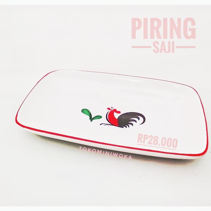 Piring saji motif ayamPanjang piring : 20cmLebar piring : 11.5cmBentuk : persegi panjangBahan : keramik porcelainWarna : putihPiring saji cantik ini bisa digunakan untuk menyajikan makanan berkuah (tidak terlalu banyak) karena bentuknya agak melengkung di tiap ujungnya.Berat produk sudah termasuk kemasan (bubble, koran dan ka