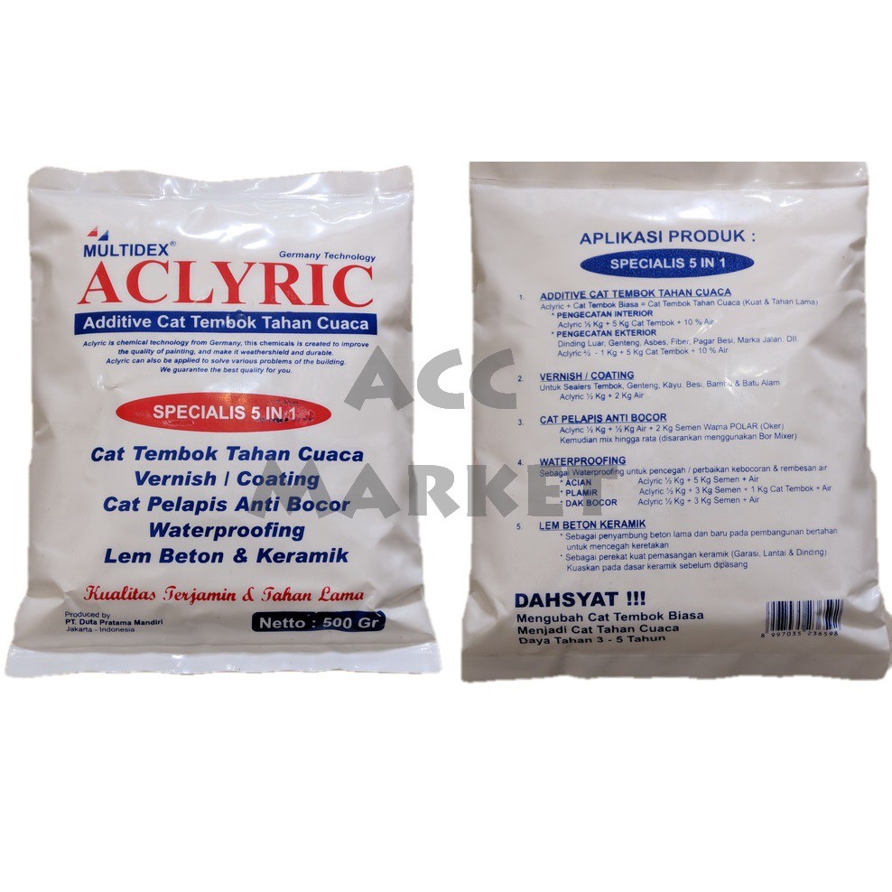 HANYA MENERIMA PENGIRIMAN PULAU JAWAMultidex Aclyric Germany Technology dapat digunakan sebagai :1. Mengubah cat tembok biasa menjadi Tahan Cuaca, Lebih kuat, Tidak Pudar, Tidak Mengelupas / Berkapur, Tahan Jamur Lumut, Retak Rambut2. Bisa digunakan sebagai Waterproofing dan Anti Bocor3. Bisa digunakan juga sebagai campuran Cat Genteng, Besi, Kayu, Bambu, Batu Alam, dll4. Dapat juga digunakan sebagai Coating & Vernish Genteng, Kayu, Bambu, Batu Alam5. Dapat digunakan sebagai Waterproofing Anti Bocor, Acian, Plamir Putty, Dak Bocor6. Bisa juga sebagai Lem Keramik & Beton7. Sebagai Penyambung Beton Lama Dengan Yang Baru dan Juga Sebagai Perekat Pemasangan Keramik8. Dan Banyak Lagi KegunaanyaKemasan : 500gCara Pemakaian : 1. Untuk Pengecatan :Aclyric 1/2kg - 1kg + Cat 5kg + Air 10%2. Untuk Coating & Vernish :Aclyric 1/2kg + Air 2kg Lalu dikuaskan pada bidang3. Untuk Cat Pelapis Anti Bocor :Aclyric 1/2kg + Air 1/2kg + 2g Semen Warna/Oker/Tile Grout4. Untuk Waterproofing :- Acian = Aclyric 1/2kg + Semen 5kg + Air- Plamir = Aclyric 1/2kg + Semen 3kg + Cat tembok 1kg + Air- Dak Bocor / Talang = Aclyric 1/2kg + Semen 3kg + Air5. Lem Perekat Beton & Keramik :Kuaskan pada bidang sebelum pemas