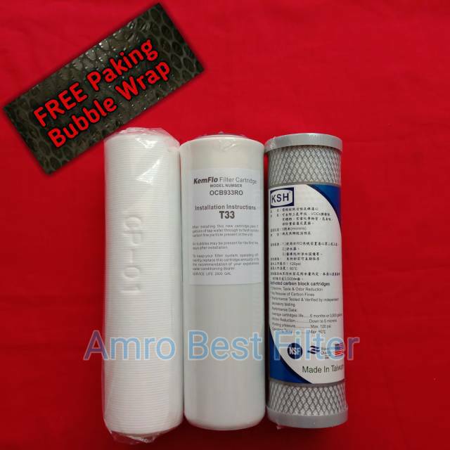 Manfaat dari pemakaian Pre Filter Kualitas Terbaik ini adalah :- Daya tahan jauh lebih lama- Melindungi Filter Membran agar lebih awet- Membuat Mesin RO bekerja lebih stabil.Isi Paket = 3 PcsTerdiri dari :~ 1 pcs Spon merk CP 1 mikron made in Japan~ 1 pcs GAC merk Kemflo made in Taiwan~ 1 pcs CTO merk KSH made in Ta